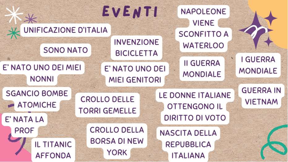 3. Si esplicita loro la prima attività richiesta: disporre gli eventi indicati nella slide sulla linea del tempo, andando ad attingere a tutte le loro preconoscenze. Laddove siano a conoscenza della data esatta, la possono indicare, altrimenti possono limitarsi a individuare la successione.