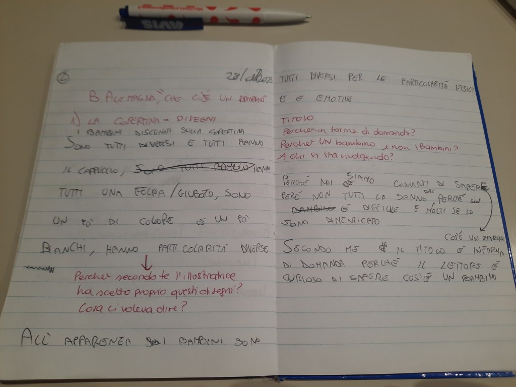 Quando erano in I, avevo proposto loro la strategia con un organizzatore grafico più strutturato, ma ora che sono abituati ad utilizzarla, ho proposto l’attività in modo diverso: ho dato 10 minuti per confrontarsi a voce sulla copertina seguendo le domande proposte e poi ho chiesto a ciascuno di loro di scrivere un’annotazione sul taccuino per raccogliere le proprie idee, seguendo sempre le domande come traccia. Mentre loro si confrontavano, io passavo tra i vari gruppi per fare consulenze.