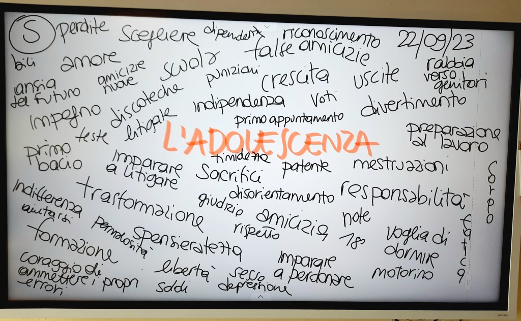 Il filo conduttore di questo percorso sarà l’adolescenza e così, senza girarci troppo intorno, abbiamo fatto insieme un brainstorming sulla parola “adolescenza”.