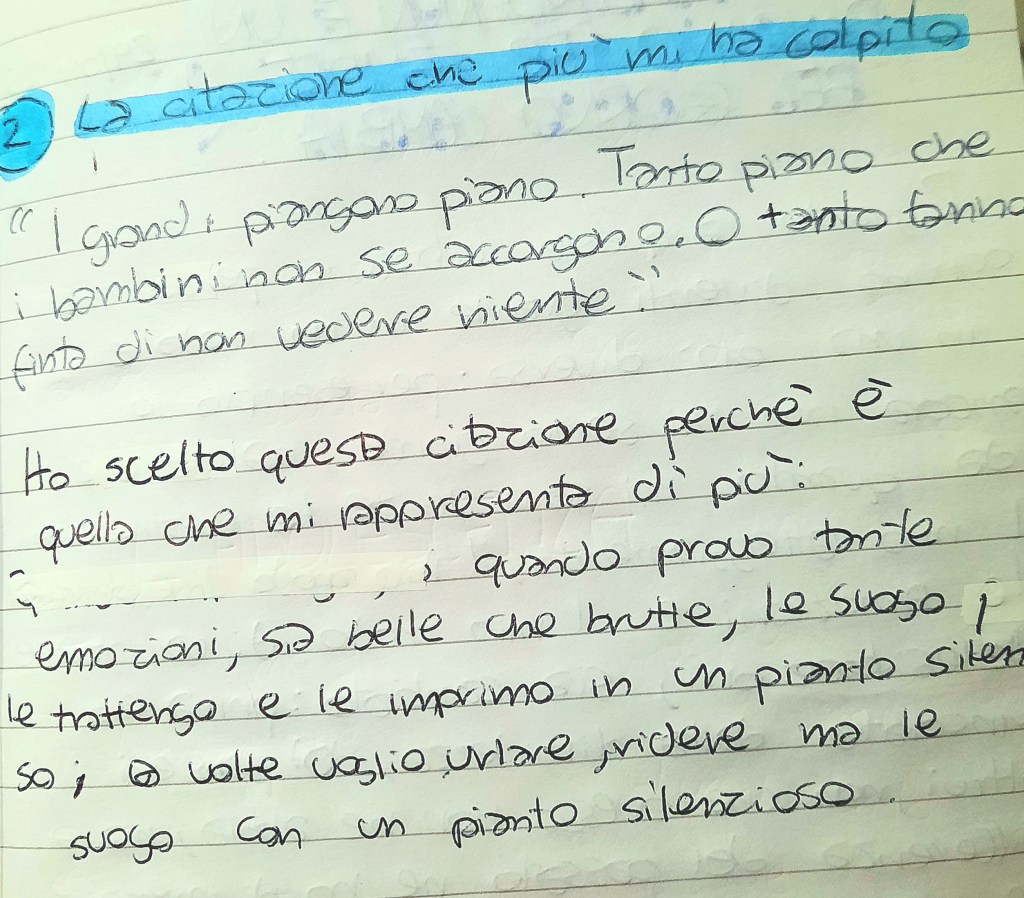 Ciascuno di loro ha poi scelto una frase tra quelle sottolineate, l’ha riportata sul taccuino e ha spiegato il perché di quella scelta: cosa ti ha colpito? Perché? Quali emozioni ti ha suscitato? E quali riflessioni?
