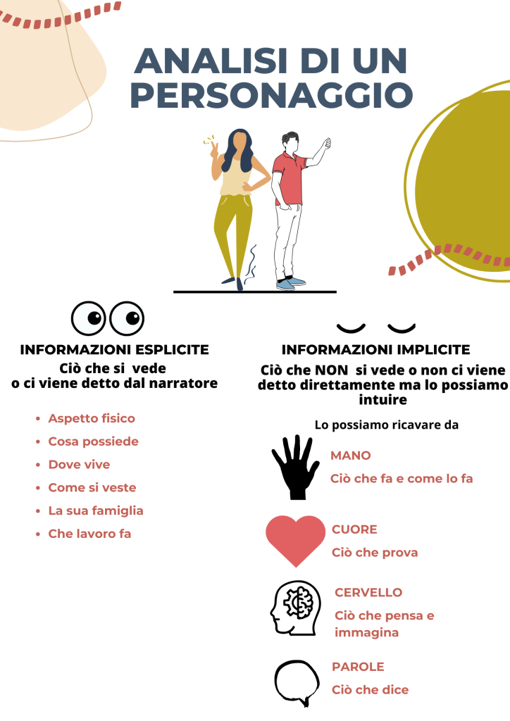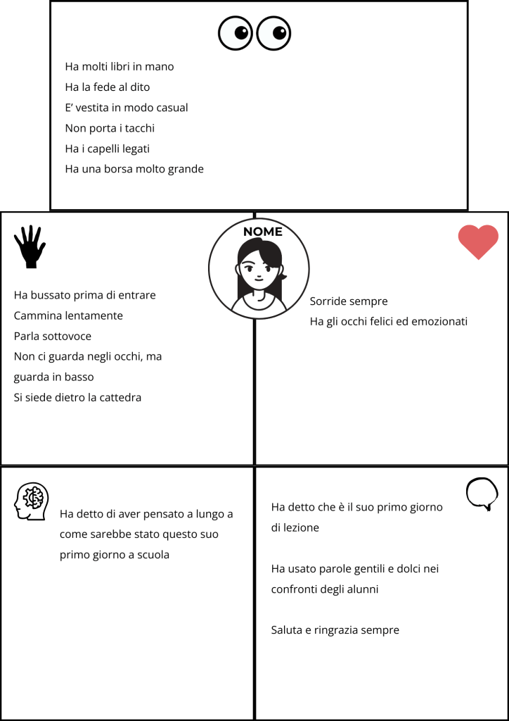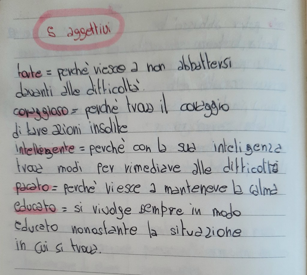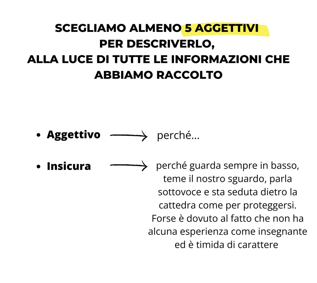 A questo punto siamo passati dalle informazioni esplicite a quelle implicite: con tutte le “prove” raccolte nell’organizzatore grafico, ho chiesto loro di inferire almeno 5 aggettivi per descrivere il loro personaggio, argomentandoli adeguatamente. Anche in questo caso ho fatto prima io modeling riprendendo il “mio” personaggio.