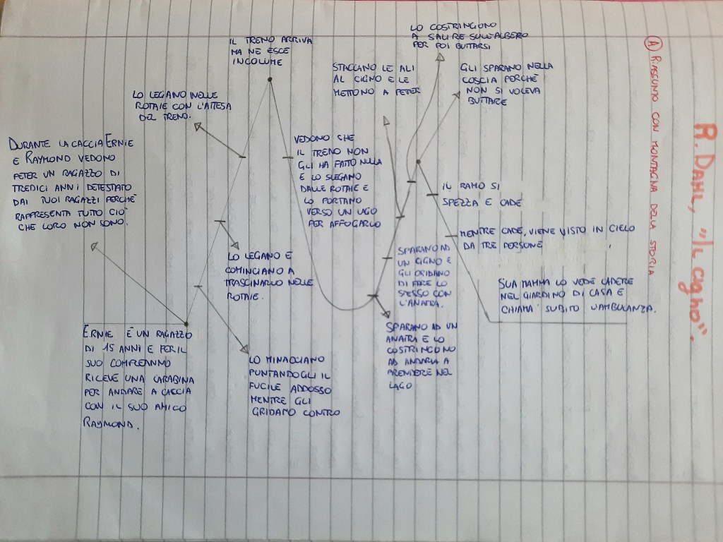 Abbiamo deciso insieme se la montagna con un solo acme fosse adatta al racconto o se la storia avesse una struttura a più picchi; tutti hanno immediatamente constatato che nel racconto di Dahl ci sono due grandi picchi: la già citata scena del treno e quella finale del cigno sull’albero.