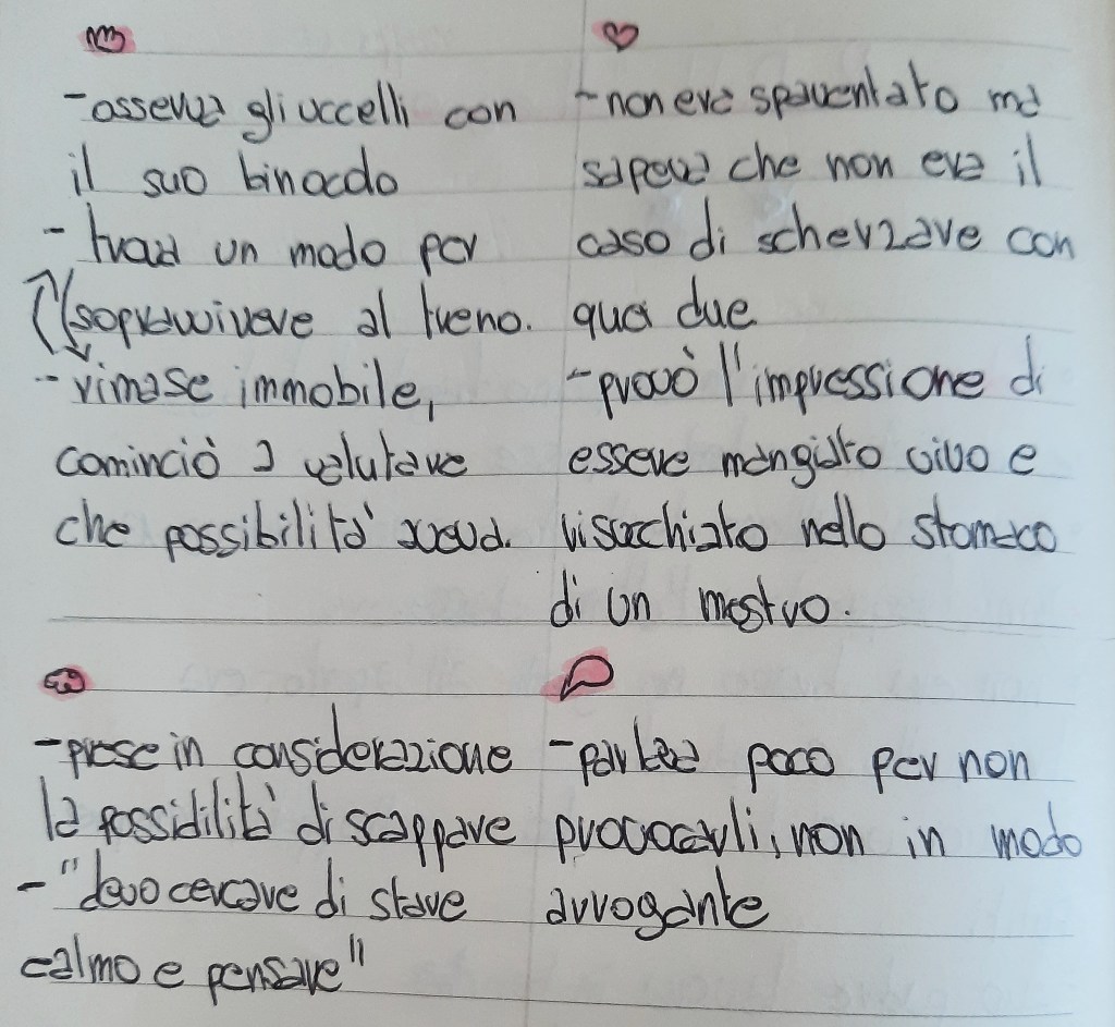 In classe, in un tempo dato, hanno scritto prima le loro impressioni, poi le loro connessioni e infine le domande; mi ha stupito come a questo punto quasi tutti fossero in grado di scrivere autonomamente per tutto il tempo a disposizione. Le difficoltà maggiori sono emerse con le domande, che riprenderò ancora.