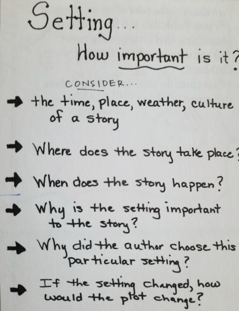 In questa lezione ho spiegato loro che un aspetto significativo di un racconto è il setting, parola di cui non conoscevano il significato. Abbiamo allora cercato di inferirlo, ipotizzandone l’etimologia che li ha subito riportati al set dei film. Una volta capito che il termine indica l’ambientazione, abbiamo cercato insieme di capire perché è un aspetto importante, ragionando ad alta voce sui setting che si susseguono all’interno del racconto Il cigno e scegliendo di approfondirne uno particolarmente significativo: la casa di Ernie che apre il racconto stesso. Abbiamo riletto ad alta voce il passo e insieme abbiamo compreso che il setting non è solo un luogo fisico, ma è molto di più. Abbiamo dunque estrapolato le caratteristiche del setting; per farlo li ho stimolati attraverso domande guida che volevano condurli a riflettere su quelle che Serravallo suggerisce come domande per ragionare intorno all’ambientazione4: