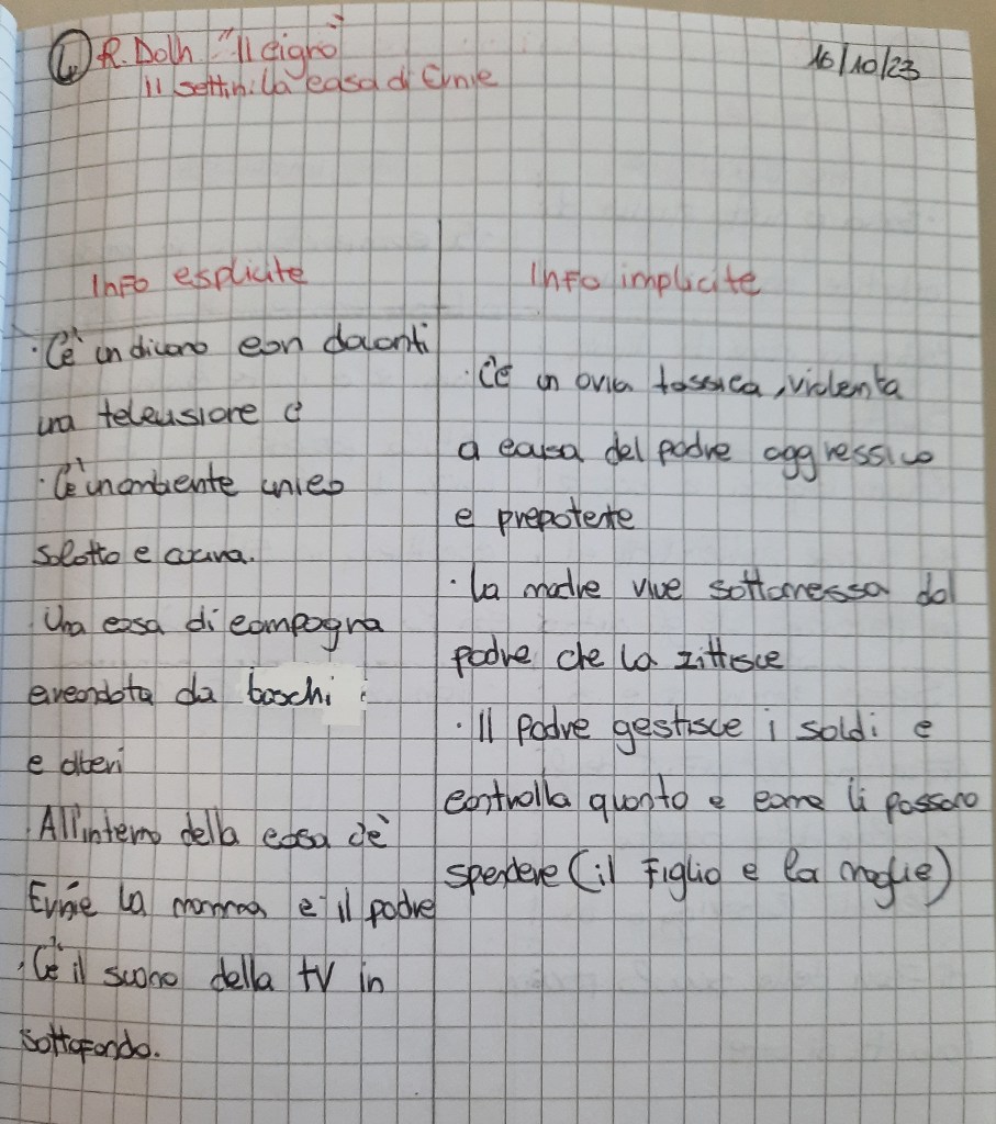 A questo punto ho chiesto loro di compilare sul taccuino una semplice tabella a T con le caratteristiche esplicite e implicite relative alla casa di Ernie: cosa ci viene detto e cosa ricaviamo dal racconto? Col senno di poi, credo che avrei forse potuto realizzare un organizzatore grafico migliore, più strutturato, che permettesse loro di mettere in rapporto le informazioni esplicite con quelle implicite.