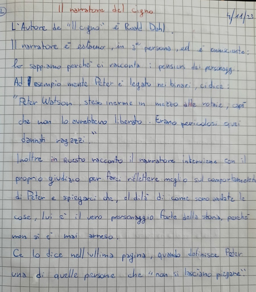 1. Al termine del lavoro su Il cigno, alla luce dei booktalk estivi, ho dedicato una lezione a spiegare come si realizza una presentazione efficace e completa di un libro letto e ho chiesto loro di realizzare un loro video-booktalk del racconto di Dahl da inviarmi via mail. Questo mi permetterà di verificare se l’analisi svolta insieme è stata efficace e ha permesso loro di avere qualcosa di personale e ben motivato da dire.