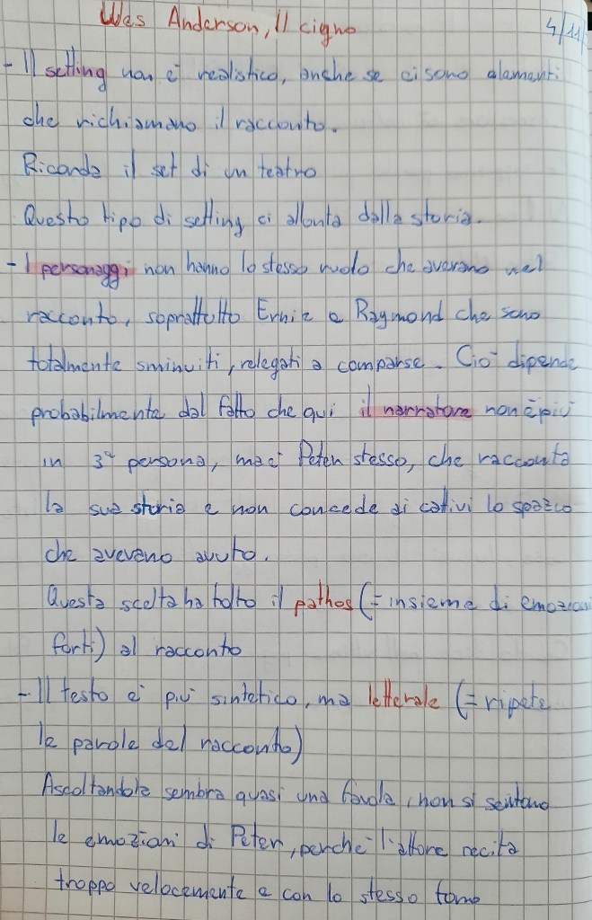 A conclusione di tutto il lavoro che ci ha impegnati per circa un mese, ho voluto far vedere loro il cortometraggio girato da Wes Anderson nel 2023, tratto proprio dal racconto Il cigno e attualmente disponibile su Netflix.