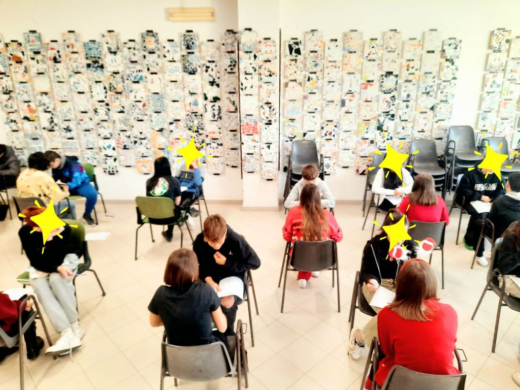 – abbiamo disposto le sedie in due file sfalsate – da una parte una classe e dall’altra l’altra classe – per permettere alle singole coppie di parlarsi senza disturbarsi.