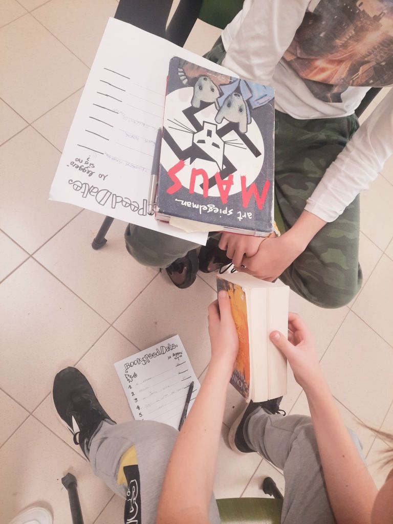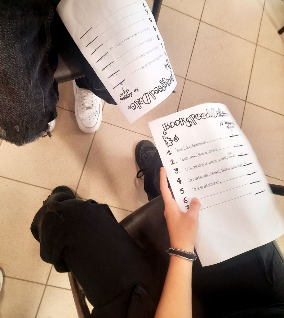 – ogni confronto l’abbiamo fatto durare 5 minuti. Noi insegnanti non siamo intervenuti se non per dettare il tempo: “cambio libro” dopo 2 minuti e mezzo per permettere all’altro studente di raccontare e “cambio postazione” per consentire il cambio posti. In tutto abbiamo fatto 7 turni.