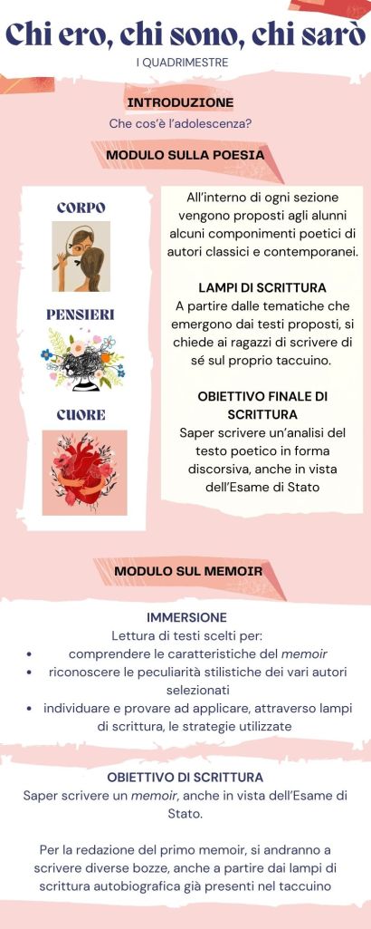 La narrazione può dare loro gli strumenti per ripercorrere la propria storia, dando valore alle luci e alle ombre del passato, per raccontare i cambiamenti del presente, provando a leggerli con un po’ più di chiarezza, per immaginarsi un futuro di cui loro saranno i protagonisti. Da qui il nostro percorso “Chi ero, chi sono, chi sarò” che, attraverso prima la poesia e poi il memoir, dà voce ai ragazzi, per aiutarli anche ad avere uno sguardo più consapevole sulle loro scelte relative alla scuola secondaria di II grado in cui iscriversi.
