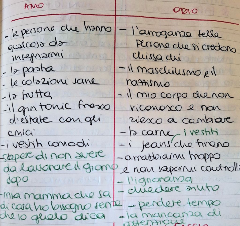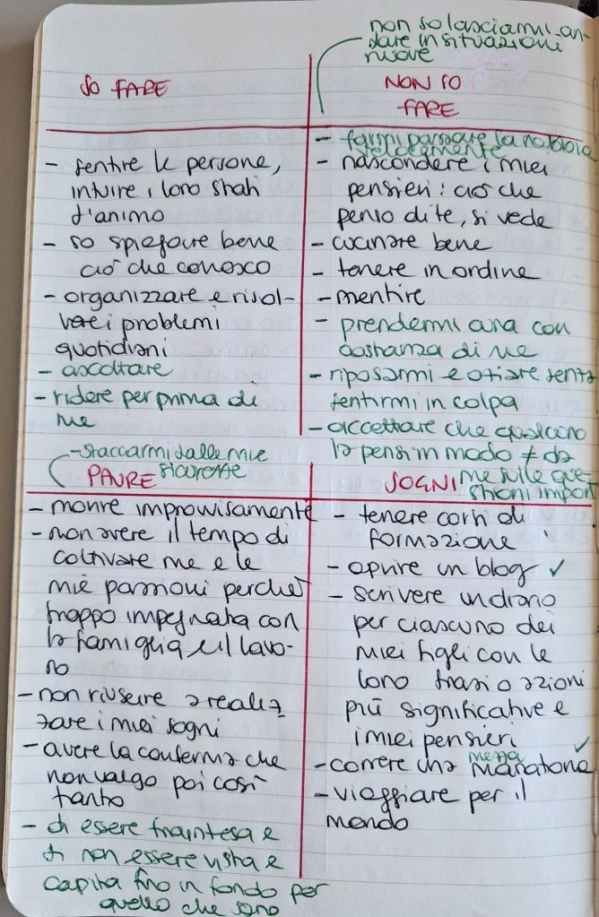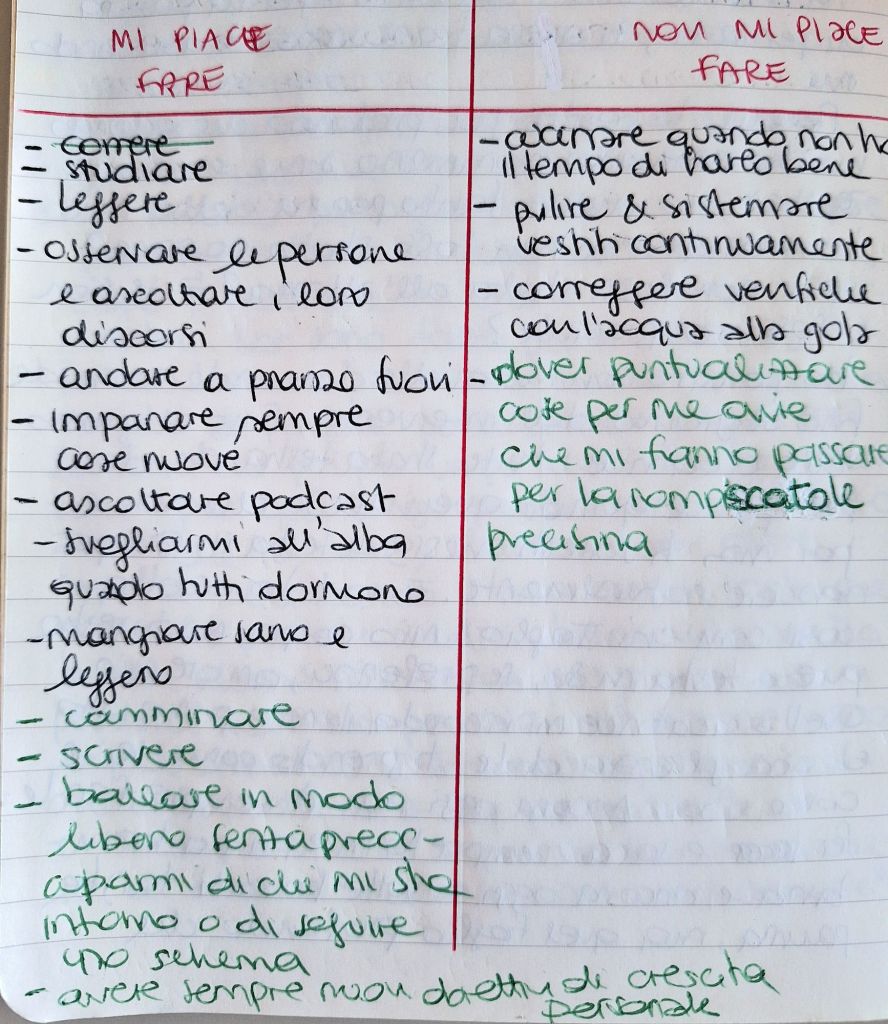 Mentre loro scrivevano, io ho ripreso in mano le mie annotazioni risalenti al precedente anno – alcune delle quali avevo condiviso con loro come modeling ad alta voce prima di dare avvio all’attività – e mi ha stupita vedere come io sia già cambiata su alcuni aspetti mentre altri siano rimasti uguali. Ho aggiunto in verde gli elementi nuovi. Se ciò è stato potente per me che sono adulta e credo di essere piuttosto autoriflessiva e consapevole, figuriamoci quanto questo strumento possa essere efficace nelle loro mani.