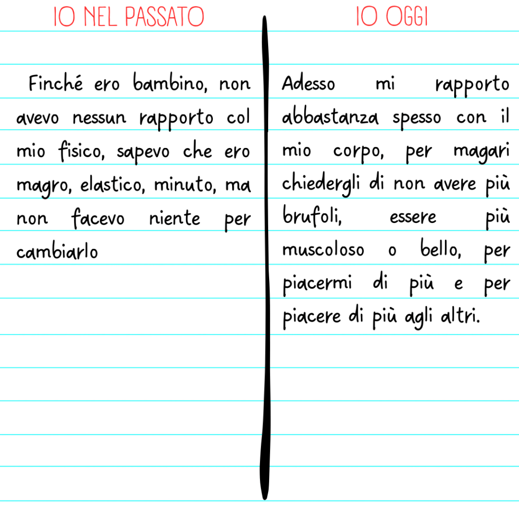 A seguire, ho chiesto loro di compilare un’altra tabella a T in cui descrivere il rapporto col loro corpo nel passato, quando erano bambini, e oggi.