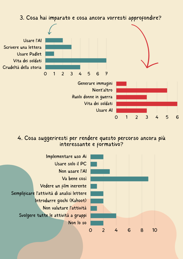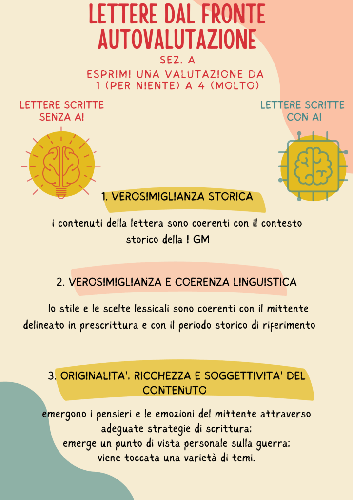 | In questa fase è stato necessario definire come creare dei prompt efficaci; un prompt è una descrizione o input che diamo all’intelligenza artificiale generativa. I prompt influenzano l’output dell’IA. Una buona formulazione può portare a risultati più accurati e creativi. Come creare prompt efficaci: Specificità: sii chiaro e specifico nel prompt. Ad esempio, invece di “scrivi una lettera di un soldato”, prova “scrivi una lettera di un soldato pugliese di 22 anni durante la Prima Guerra Mondiale” Dettagli: aggiungi dettagli importanti. Ad esempio, “il soldato appartiene all’alta borghesia dell’epoca, ha un buon grado d’istruzione”. Esperimenti: prova diverse formulazioni per vedere quale funziona meglio. Anche in questo contesto vale sempre la buona regola delle 5W. In questa fase gli alunni si sono dimostrati molto curiosi e proattivi, con la voglia di sperimentare e non di accontentarsi del primo risultato. In alcuni casi hanno “personalizzato” il testo creato con AI aggiungendo parole o espressioni che ritenevano più opportune, dimostrando di saper gestire lo strumento in base al risultato che volevano ottenere. | Gli alunni si sono dimostrati autonomi e capaci. Hanno consultato Internet laddove hanno espresso il desiderio di approfondire alcuni aspetti sui cui non ci eravamo concentrati nelle lezioni di storia e che riguardavano nozioni di storia sociale dell’epoca: “Ma cosa mangiavano in trincea?” “Prof., il nostro soldato viene dal Piemonte, possiamo andare a cercare su Internet alcune espressioni del dialetto torinese da inserire nella lettera?” “Ma all’epoca è verosimile che un soldato avesse un mutuo con la banca per pagare la casa?” “Prof., ma da quando si è iniziato a usare la parola pettegolezzo? Posso scriverla?” “Cosa mandavano le famiglie nei pacchi che spedivano in trincea?” “Posso chiamare il fratellino Tommy?” “Che nomi davano all’epoca agli animali domestici?” |