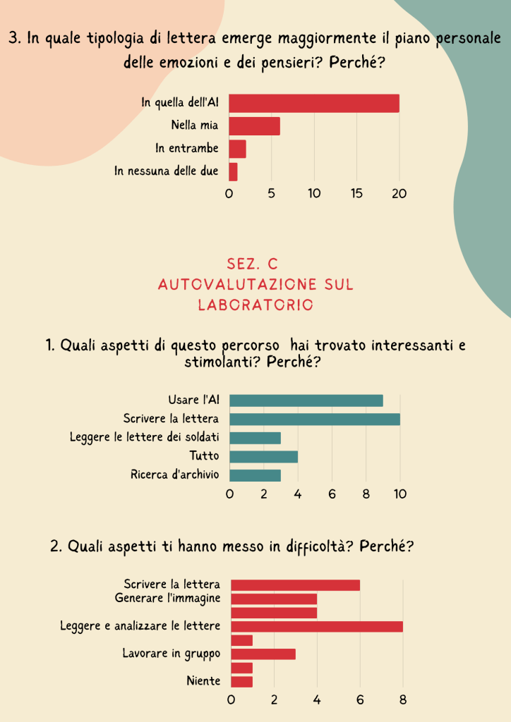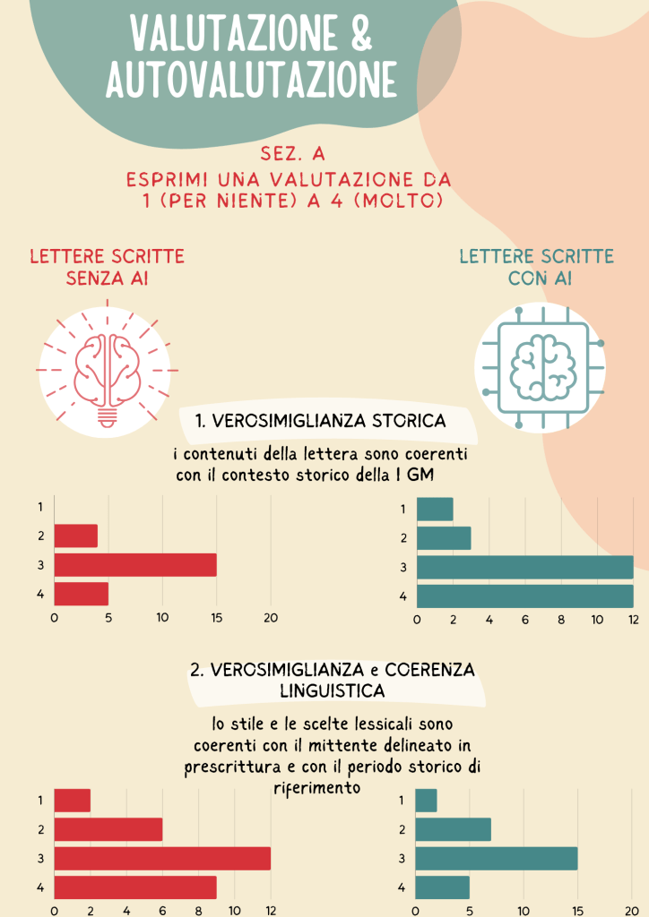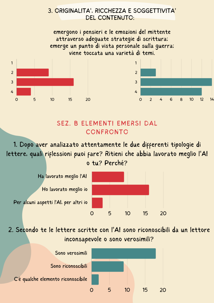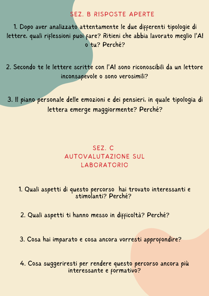 Al termine del percorso abbiamo creato un momento di riflessione, affinché i ragazzi avessero modo prima di mettere a confronto le lettere da loro prodotte con e senza AI per ragionare con cognizione di causa sui punti di forza e di debolezza delle due differenti modalità di scrittura, secondariamente di valutare il percorso e autovalutare il loro operato.