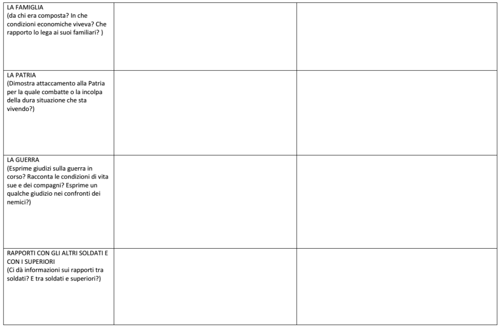 | CONSEGNA Immagina di essere al fronte e di scrivere una lettera alla tua famiglia. Puoi ispirarti a uno dei 4 mittenti delle fonti esaminate: crocerossina, prigioniero di guerra, soldato semianalfabeta, soldato alfabetizzato. PRESCRITTURA Prima d’iniziare a scrivere, costruisci il personaggio, in modo che la tua lettere possa essere verosimile e coerente con il tuo mittente sia dal punto di vista del contenuto, sia da quello dello stile: NOME E COGNOME ETÀ PROVENIENZA PROFESSIONE PRIMA DELLA GUERRA FAMIGLIA GRADO DI ALFABETIZZAZIONE RUOLO IN GUERRA | |