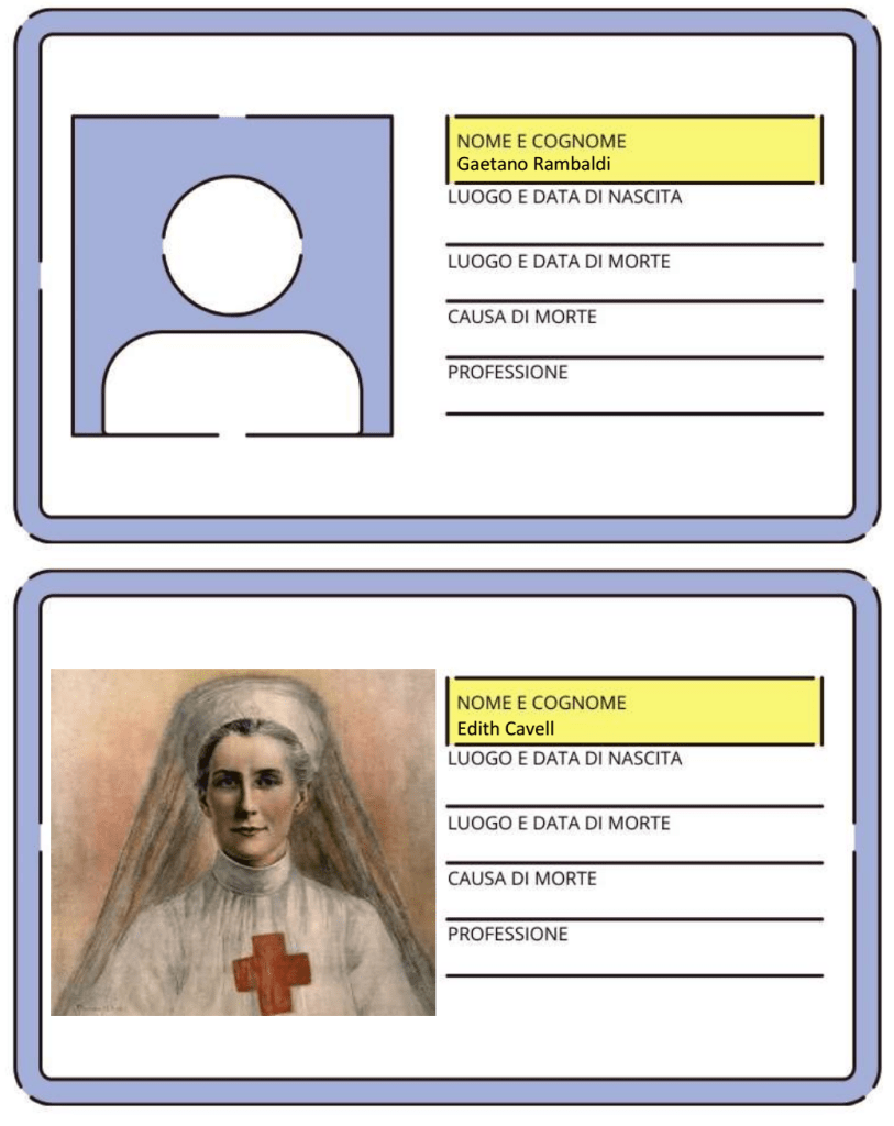 A questo punto abbiamo confrontato in plenaria le informazioni emerse4 e siamo andati alla ricerca di dati biografici più precisi per scoprire cosa ne fosse stato dei soldati incontrati e dell’infermiera Edith Cavell e compilare così le loro carte d’identità incollate sul quaderno (qui il file PDF da scaricare).