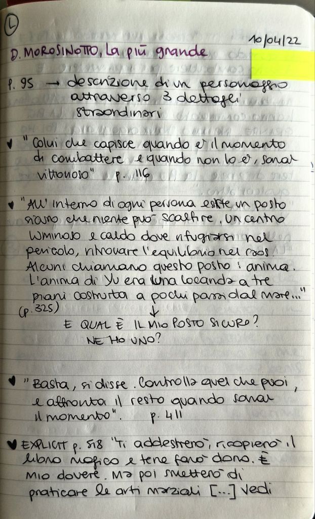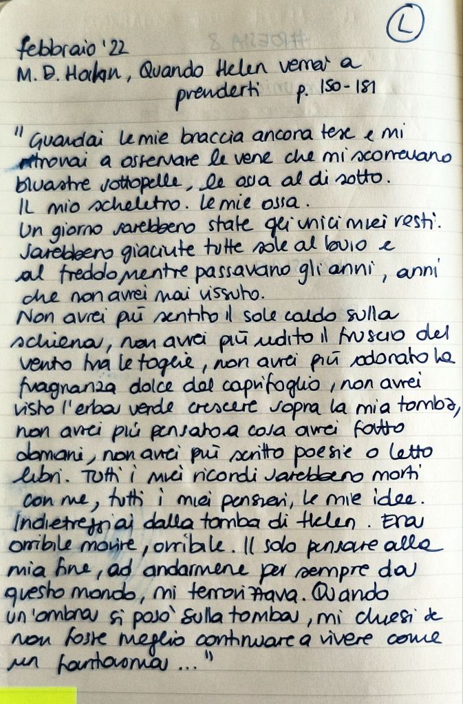 Annotazione scritta durante la lettura del romanzo per tenere traccia delle frasi e degli aspetti che più mi hanno colpita, così da poterli citare in occasione del booktalk alla classe.