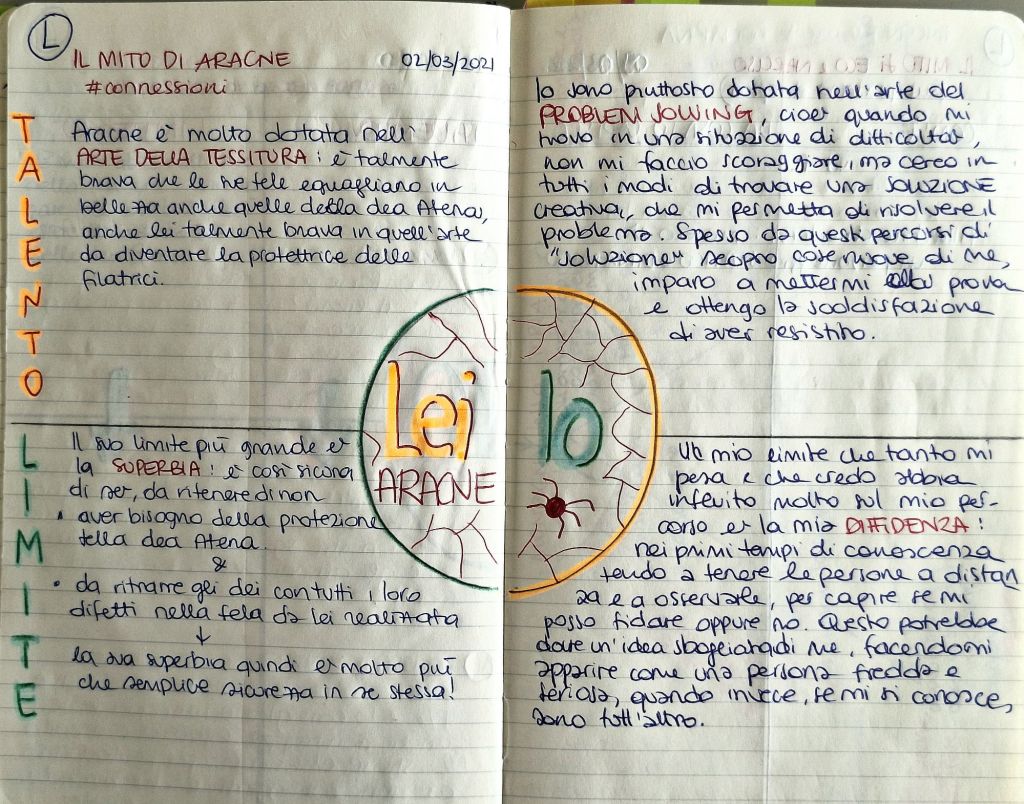 Organizzatore grafico da me predisposto dopo la lettura del mito per ragionare sui talenti e i limiti del personaggio e confrontarli coi miei; l’ho poi presentato alla classe: abbiamo compilato insieme la parte dedicata ad Aracne e ho chiesto a ciascuno di loro di completare quella autobiografica. L’abbiamo in seguito riutilizzato per gli altri protagonisti del mito incontrati.